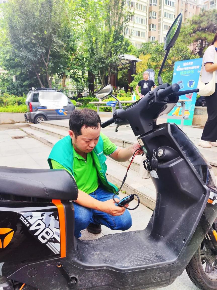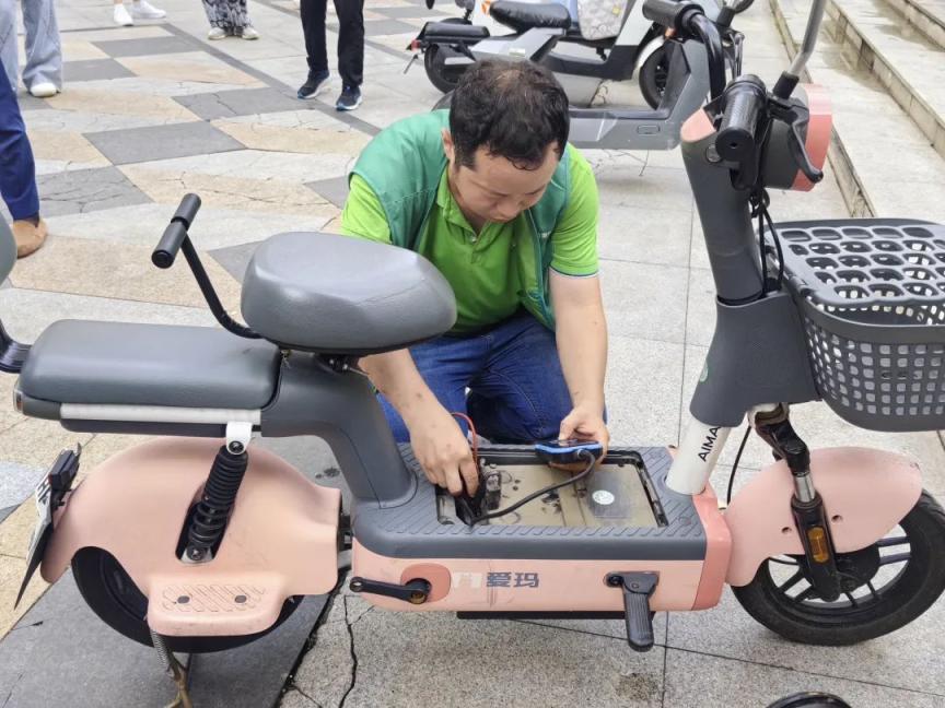 在国瑞城小区中心广场内,由区城管委、崇外街说念和谐北京全回电科技有限公司成立的电板安全检测管事台前东说念主头攒动。相近住户或推着自家电动自行车,或提着万里长征的车用电板,在现场使命主说念主员的教会下有序列队、登记参与电板“体检”。