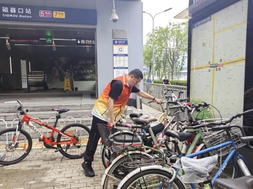 距离广渠门内大街与白桥大街交叉口宣传站点不迢遥,地铁7号线磁器口站G口处,社工、志愿者们教会自行车、电动自行车有序停放。这其中,便有3名来自隔壁商户的志愿者。